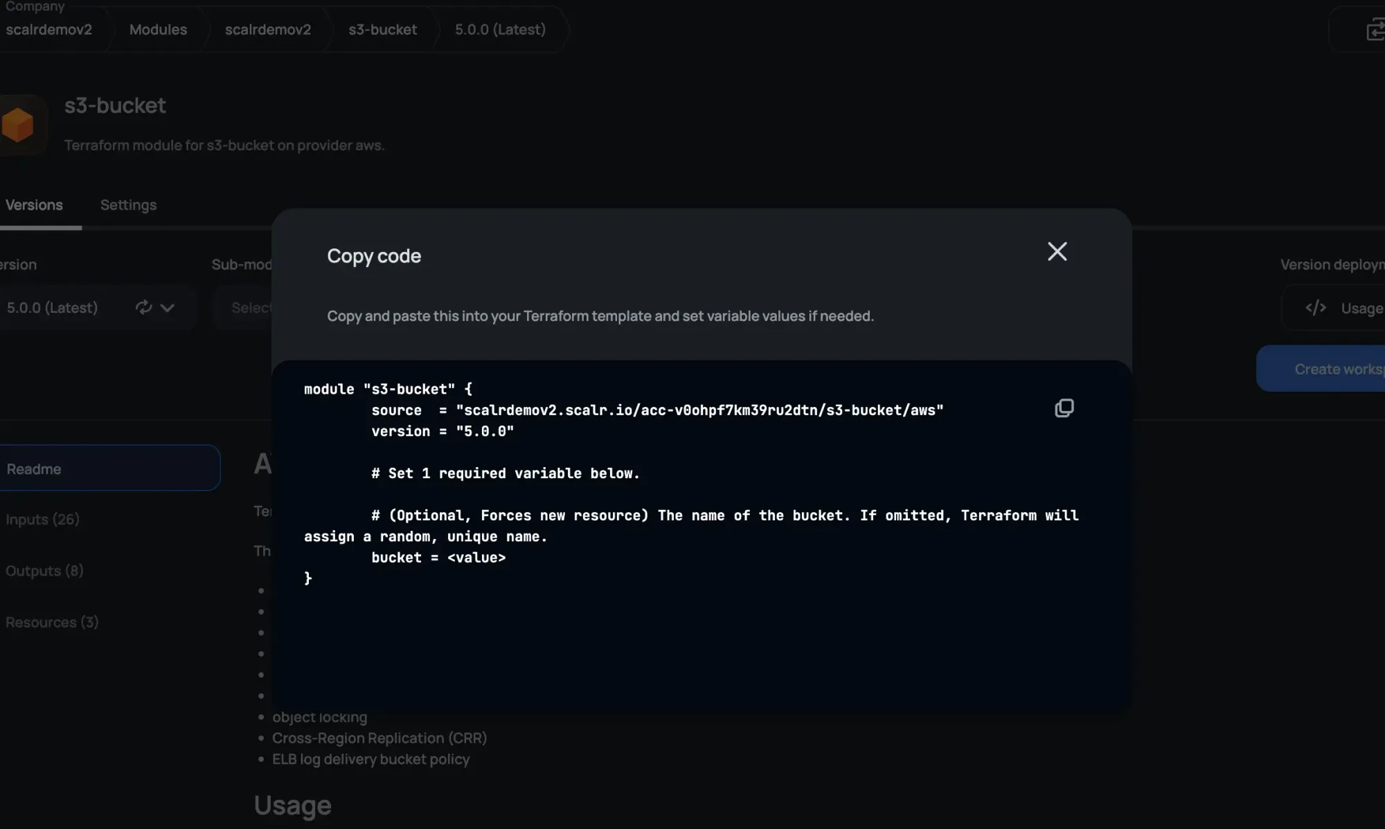 - Scalr: A comprehensive Infrastructure as Code management platform that includes a fully featured private registry. It automatically syncs private modules from your VCS (GitHub, GitLab, etc.) when your Platform team tags a release with SemVer (e.g.,