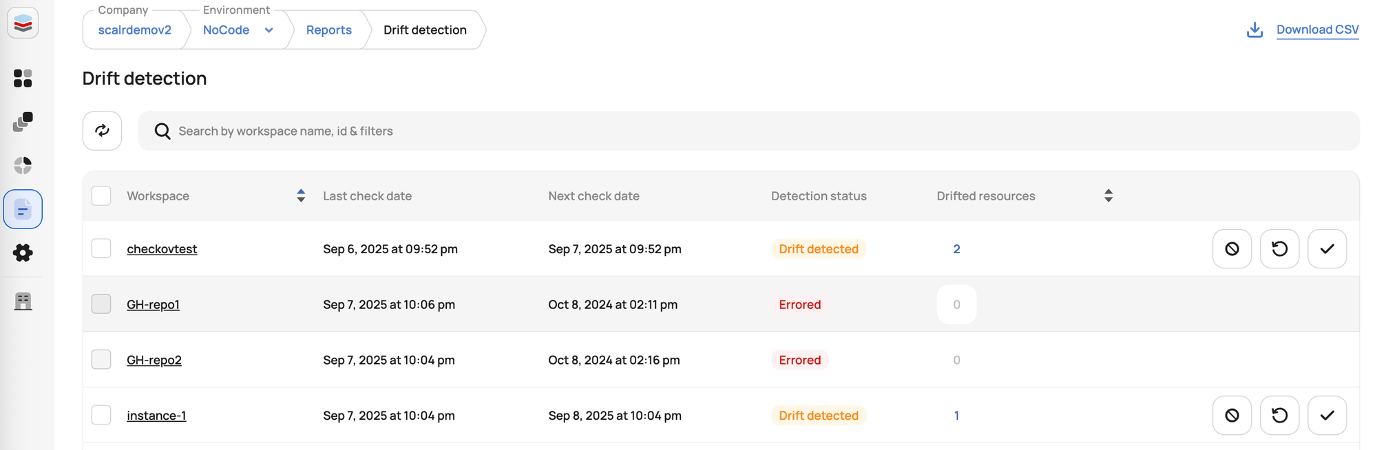 Scalr has a built-in, automated drift detection feature. You can enable it at the environment level and schedule it to run as frequently as you need. When a drift check runs, Scalr compares the current state of your infrastructure with the last known good state from your Terraform code. If any discrepancies are found, Scalr flags the workspace as "drifted."